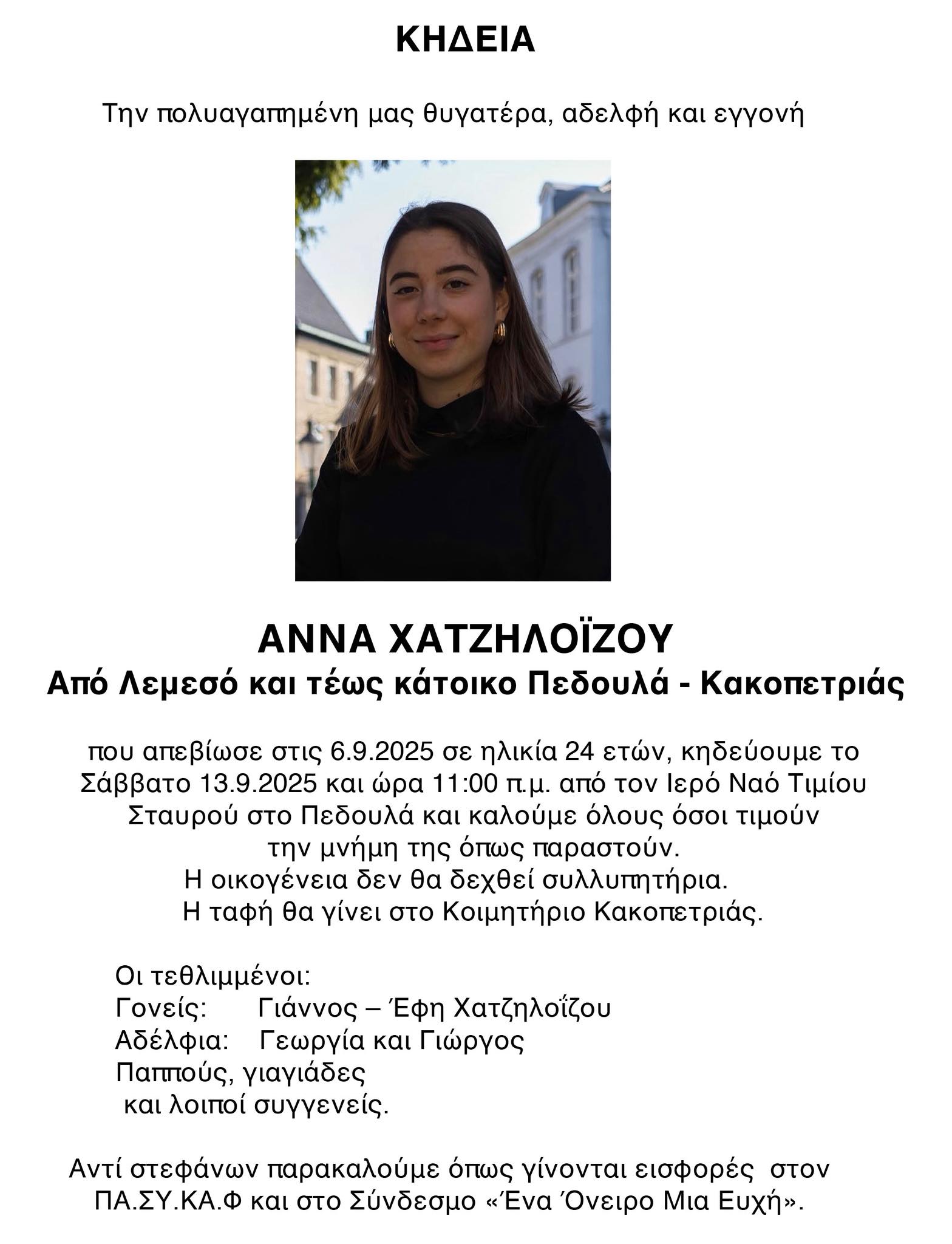 Την αγγελία για τη κηδεία αναδημοσίευσε το Κοινοτικό Συμβούλιο Πεδουλά, καλώντας τον κόσμο να πει το τελευταίο αντίο στην 24χρονη Άννα.