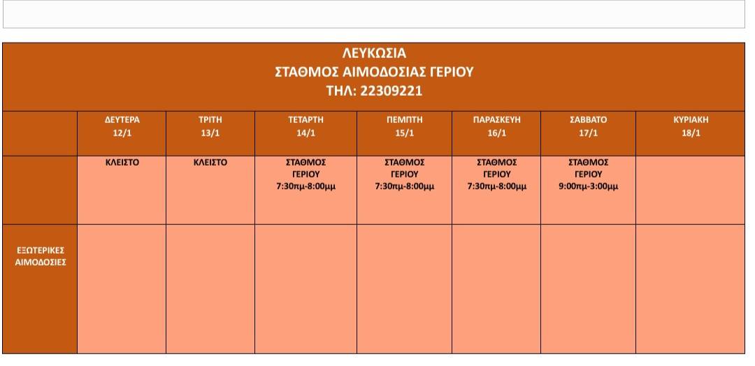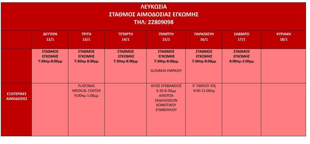 Όπως κάθε φορά, ο Σταθμός Αιμοδοσίας στην Έγκωμη είναι ανοιχτός κάθε πρωί από τις 07:30 π.μ. μέχρι τις 08:00 π.μ, ενώ το Σάββατο η αιμοδοσία είναι μέχρι τις 14:00 μ.μ.