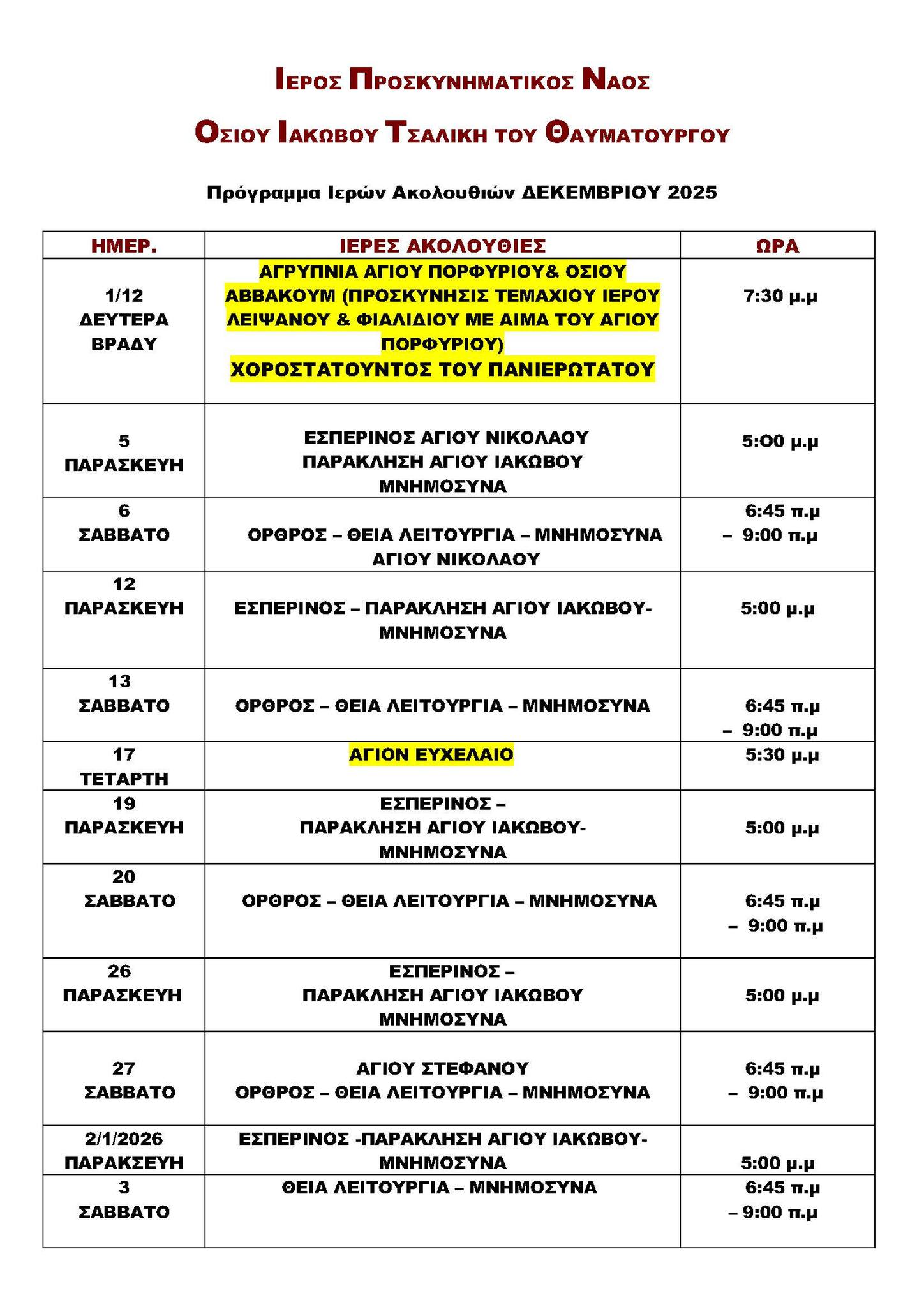 Πρόγραμμα Ακολουθιών του μήνα στο Παρεκκλήσιο του Οσίου Ιακώβου στο Ακάκι