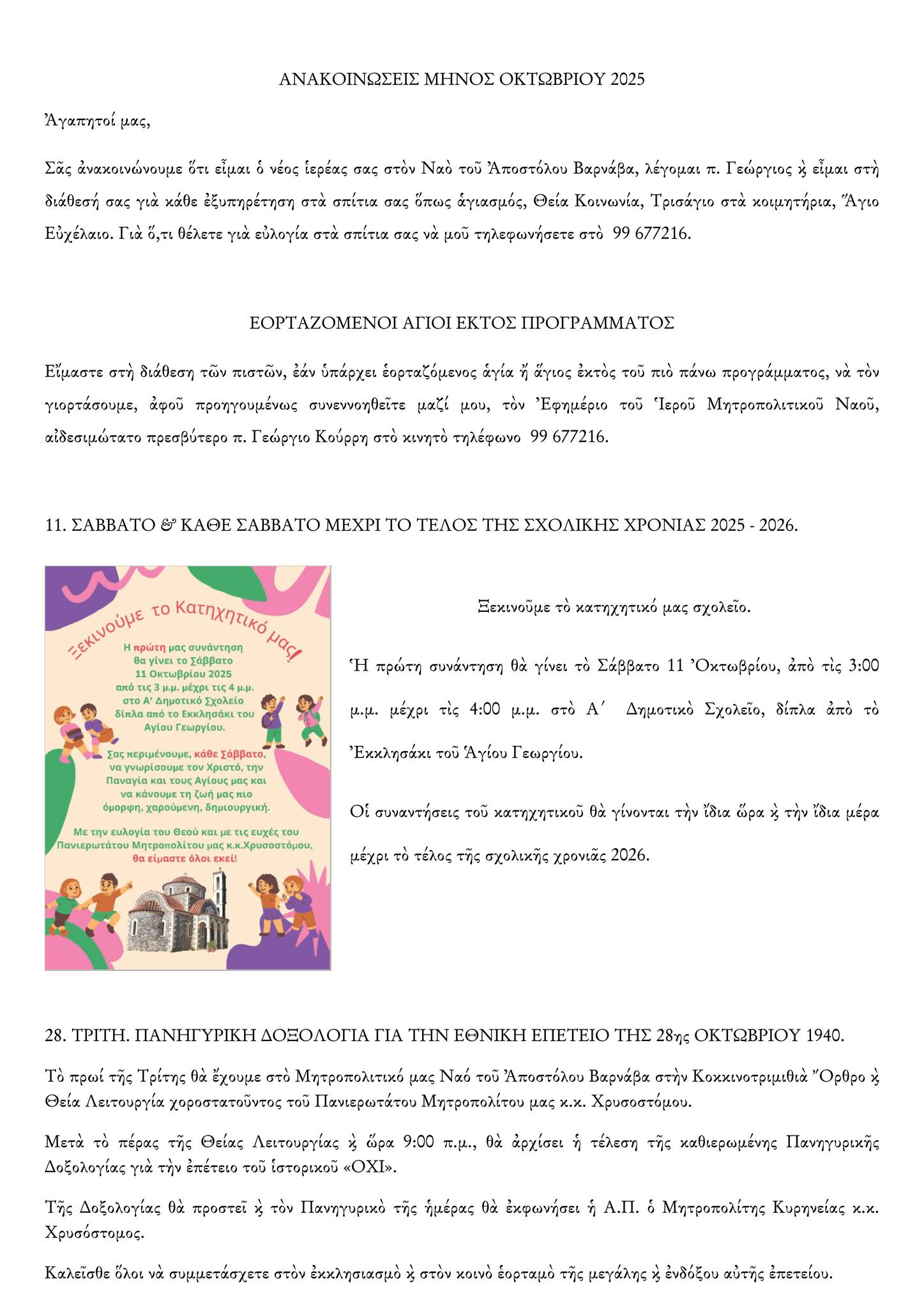 Όπως αναφέρει ο π. Γεώργιος, είναι διαθέσιμος για κάθε εξυπηρέτηση στα σπίτια όπως Αγιασμούς, Θεία Κοινωνία, Τρισάγια στα κοιμητήρια, Άγιο Ευχέλαιο κοκ. Την ίδια ώρα, ανακοινώνεται η έναρξη του κατηχητικού σχολείου.