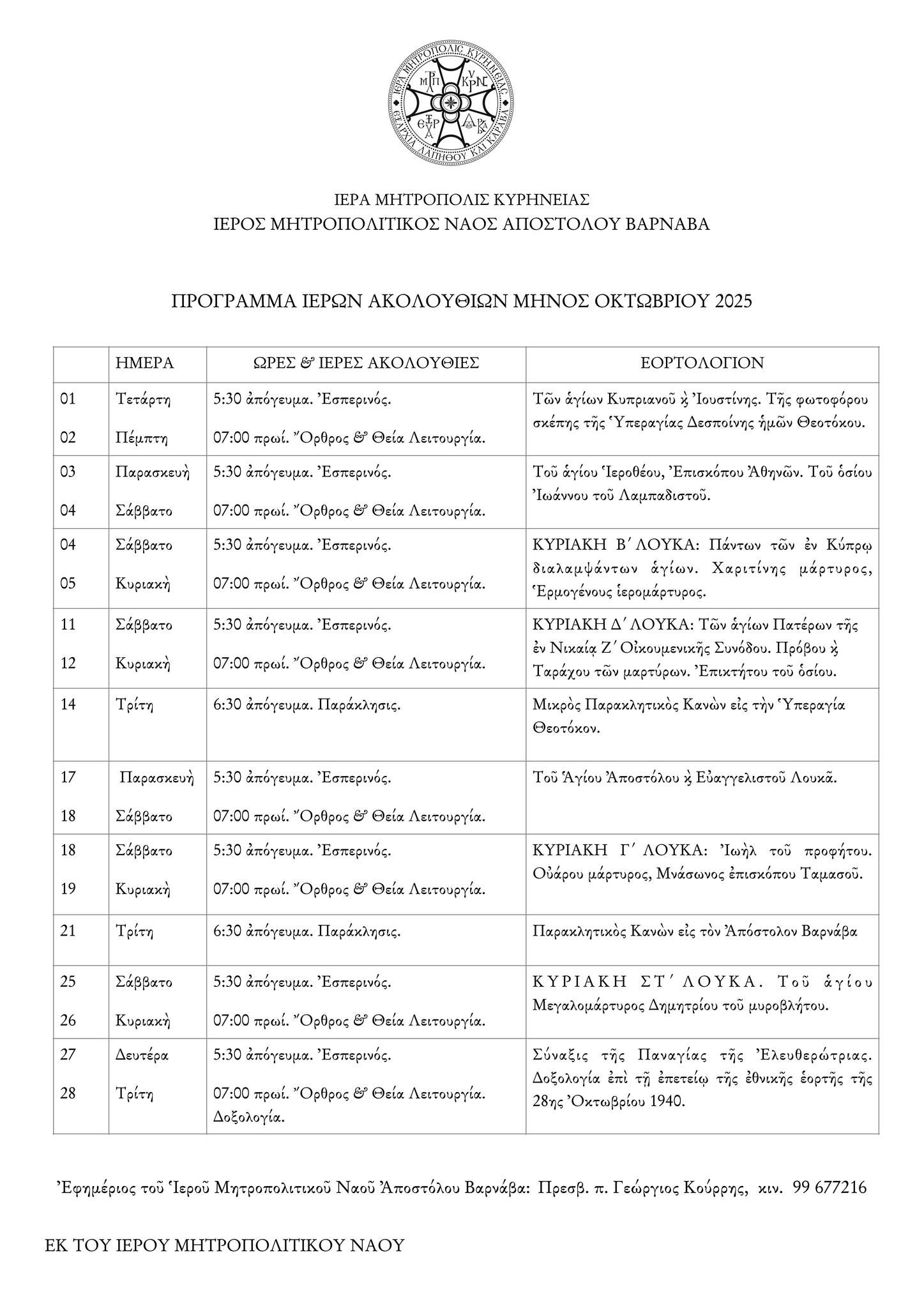 Το πρόγραμμα των Ιερών Ακολουθιών στον Ιερό Ναό Αποστόλου Βαρνάβα στην Κοκκινοτριμιθιά εξέδωσε η Ιερά Μητρόπολη Κυρηνείας, ενώ, σε δεύτερη ανακοίνωση, ο νέος πατέρας του Ναού π. Γεώργιος παρουσιάζεται στην ενορία.