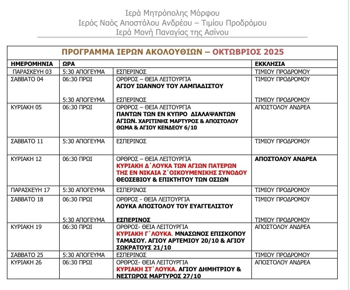 Το Πρόγραμμα των Ιερών Ακολουθιών Νικηταρίου για τον Οκτώβριο