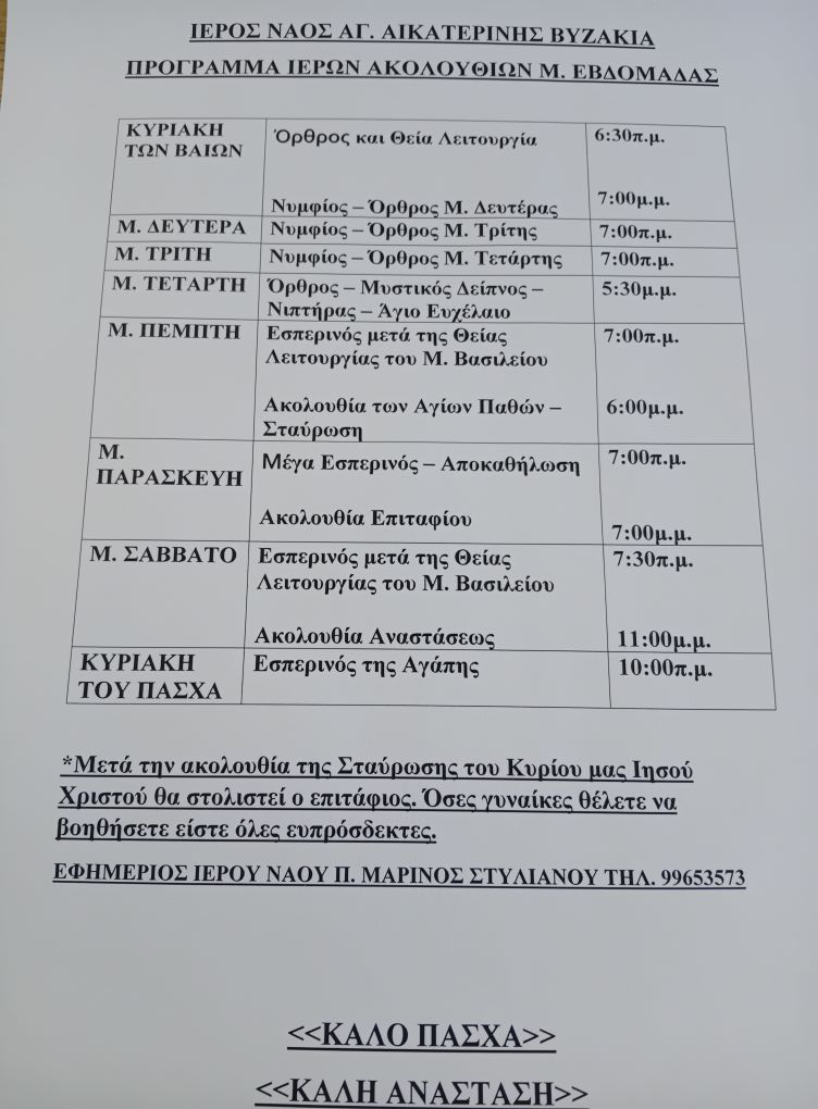 Το Πρόγραμμα Ιερών Ακολουθιών της Μεγάλης Εβδομάδας ανήρτησε η Ενορία Βυζακιάς.