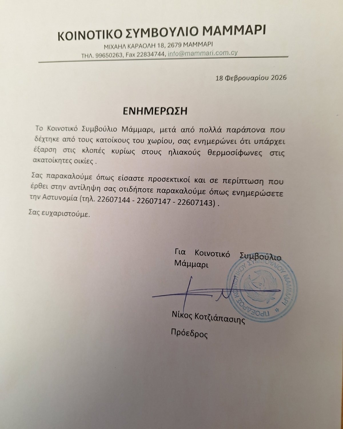 Έξαρση στις κλοπές παρατηρείται στην Κοινότητα Μάμμαρι, κυρίως στους ηλιακούς θερμοσίφωνες στις ακατοίκητες οικίες.