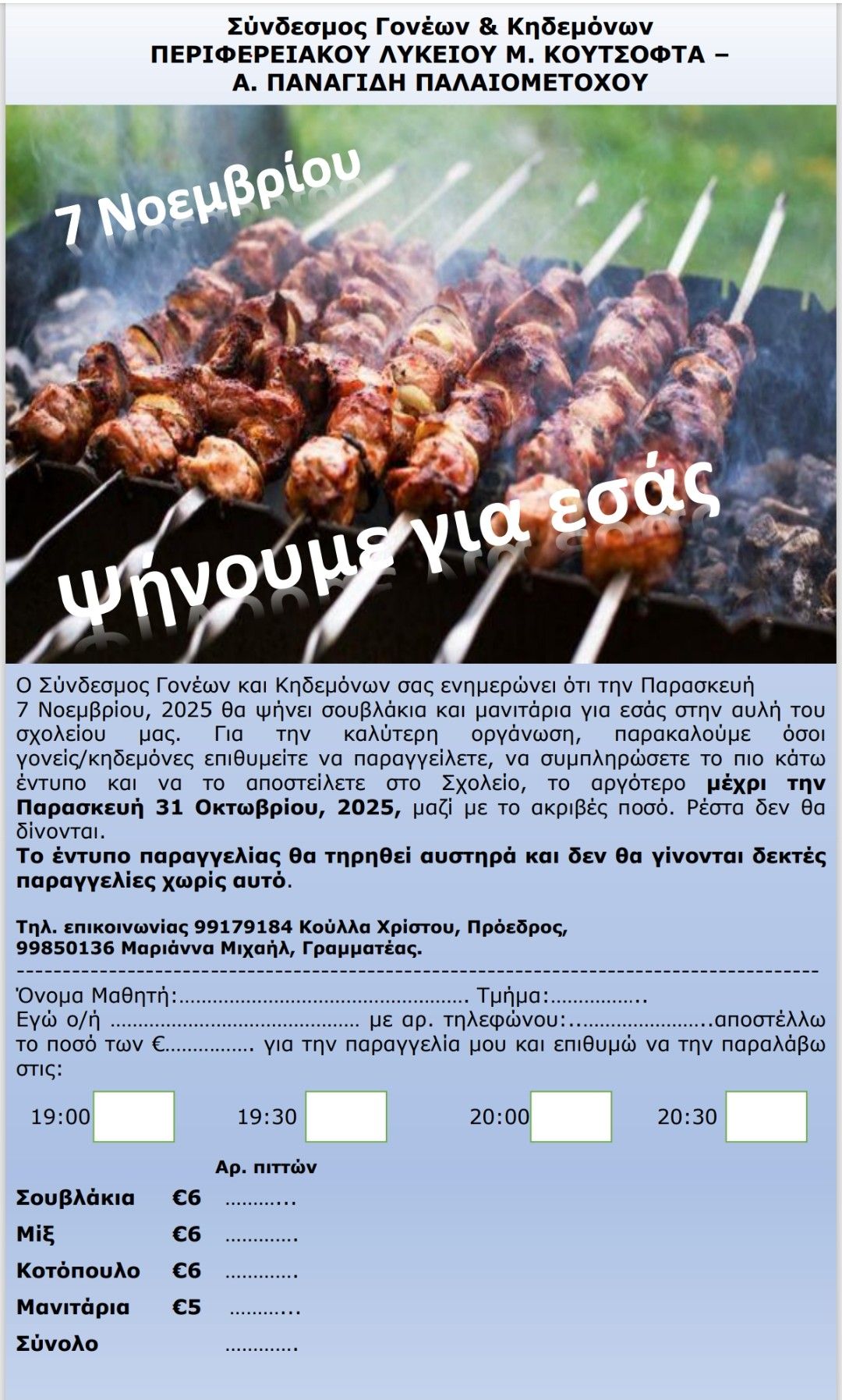 Ο σύνδεσμος με ανακοίνωσή του ενημερώνει τους γονείς να παραγγείλουν έγκαιρα, συμπληρώνοντας του παρακάτω έντυπο.