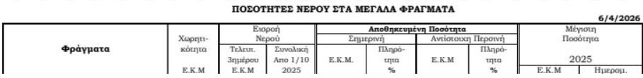 Ερωτηθείς από το ΚΥΠΕ, ο κ. Χατζηκωστής ανέφερε ότι η πληρότητα στα φράγματα σήμερα είναι στο 33,9% και η αποθηκευμένη ποσότητα είναι 98,7 εκατομμύρια κυβικά μέτρα.