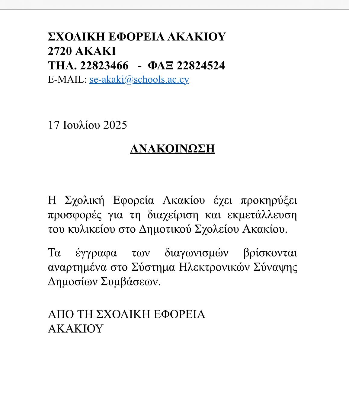 Σε προσφορές βγήκε η Σχολική Εφορεία Ακακίου – Δείτε τι αφορά July 19, 2025 ΕπικαιρότηταΔυτική ΛευκωσίαΟικονομίαΕπιχειρηματικότηταΤοπικάΚοινωνία Σε προσφορές για τη διαχείριση και εκμετάλλευση του κυλικείου στο Δημοτικό Σχολείο Ακακίου, έχει βγει η σχολική εφορεία Ακακίου. Τα έγγραφα των διαγωνισμών βρίσκονται αναρτημένα στο σύστημα Ηλεκτρονικών Σύναψης Δημοσίων Συμβάσεων. ΗΜΕΡΟΛΟΓΙΟ ΕΚΔΗΛΩΣΕΩΝ ΤΕΛΕΥΤΑΙΕΣ ΕΝΗΜΕΡΩΣΕΙΣ Υπερασπίζονται τη Mercosur οι κυβερνώντες – Αντιδρούν οι αγροτικές οργανώσεις και κόμματα Αγροτοκτηνοτροφικά Δείτε τους μισθούς όλων των Κρατικών Αξιωματούχων – Πρόεδρος, Δικαστές, Υπουργοί, Επιτρόποι, Βουλευτές κ.α. Οικονομία Περίπου στο μισό της κανονικής η βροχόπτωση αυτό το μήνα – Δείτε για Πλατάνια και Λευκωσία Δυτική Λευκωσία ΣΧΕΤΙΚΑ ΑΡΘΡΑ Υπερασπίζονται τη Mercosur οι κυβερνώντες – Αντιδρούν οι αγροτικές οργανώσεις και κόμματα Αγροτοκτηνοτροφικά Previous articleΑρδευτική συνέλευση Μουτουλλά – Όλες οι πληροφορίεςNext articleΚαλοπαναγιώτης: Από νωρίς το πρωί καθάρισαν το χωριό τους – “Καλοί μου άνθρωποι, αυτά που εσείς πετάξατε…” Φωτογραφίες