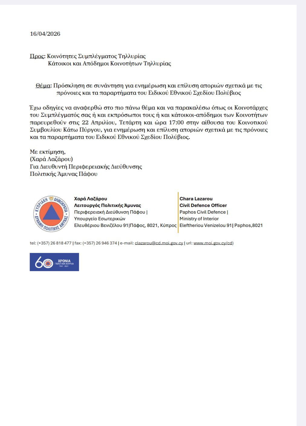Για το ειδικό Εθνικό Σχέδιο Πολύβιος θα υπάρξει συνάντηση μεταξύ των κοινοτήτων της Τηλλυρίας και της Πολιτικής Άμυνας.