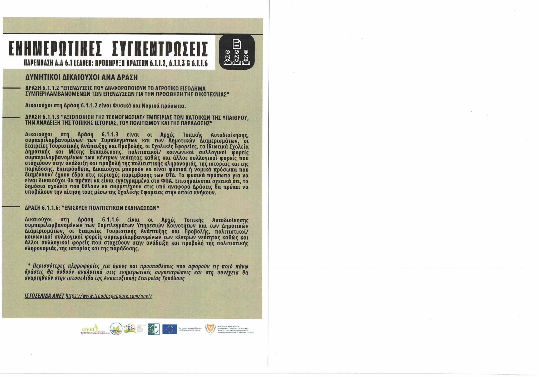 Η Αναπτυξιακή Εταιρεία Τροόδος ΑΝΕΤ διοργανώνει συγκεντρώσεις για πληροφόρηση κατοίκων και φορέων, για θέματα που αφορούν το αγροτικό εισόδημα, επενδύσεις σε οικοτεχνία, πολιτσιμό, τοπική ιστορία και πολιτιστικές εκδηλώσεις.