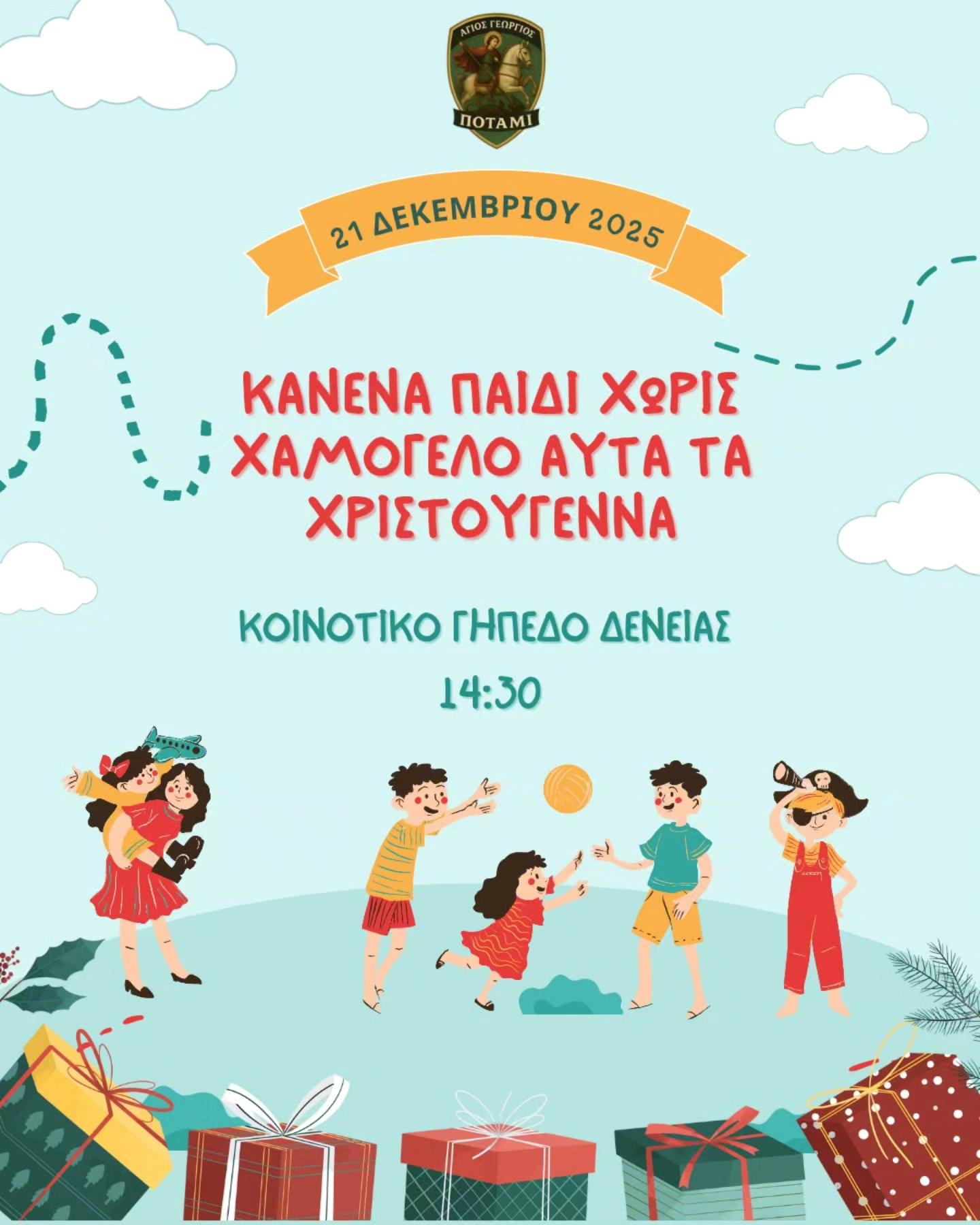 Με πρωτοβουλία του Διοικητικού Συμβουλίου ‘”Άγιος Γεώργιος Ποτάμι” θα πραγματοποιηθεί η δράση «ΚΑΝΕΝΑ ΠΑΙΔΙ ΧΩΡΙΣ ΧΑΜΟΓΕΛΟ ΑΥΤΑ ΤΑ ΧΡΙΣΤΟΥΓΕΝΝΑ», με στόχο τη στήριξη παιδιών που στερούνται παιχνίδια, αρκουδάκια ή άλλα βασικά παιδικά είδη, τα οποία θα δοθούν σε ιδρύματα και οργανισμούς, αναφέρει σε ανακοίνωσή του το σωματείο της Αθλητικής Ομάδας.