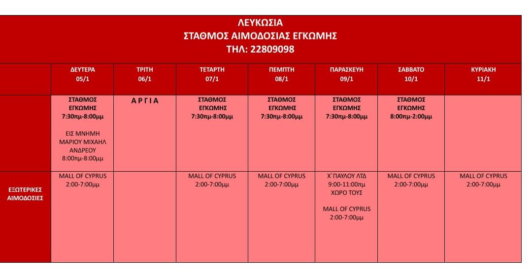 Τα σημεία αιμοδοσίας στην Λευκωσία, ανακοίνωσε το Κέντρο Αιμοδοσίας Κύπρου.