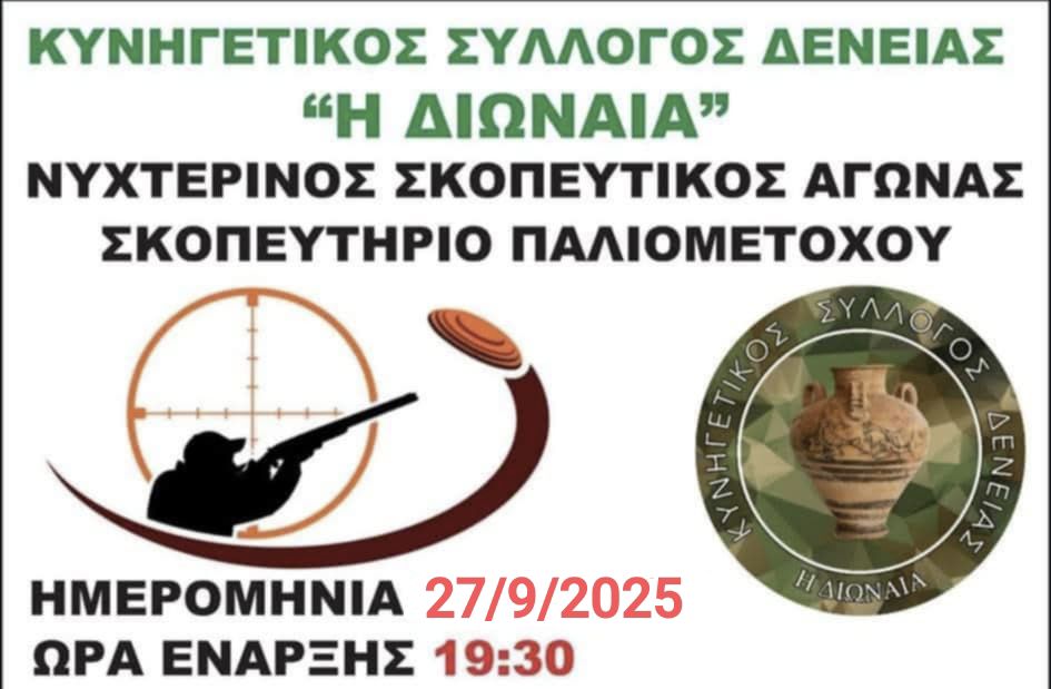 Ο Κυνηγετικός Σύλλογος Δένειας η Διωναία διοργανώνει σκοπευτικό αγώνα.