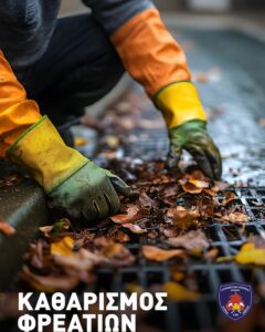 Ενόψει της χειμερινής περιόδου, κατά την οποία οι βροχοπτώσεις είναι εντονότερες, προτρέπουμε και απευθύνουμε έκκληση προς τους συμπολίτες μας να διατηρούν καθαρές τις υδρορροές στις στέγες και τις σχάρες μπροστά από τα σπίτια τους, απομακρύνοντας φύλλα, σκουπίδια, φερτά υλικά κ.ά., ώστε να μην παρεμποδίζεται η απορροή των όμβριων υδάτων.