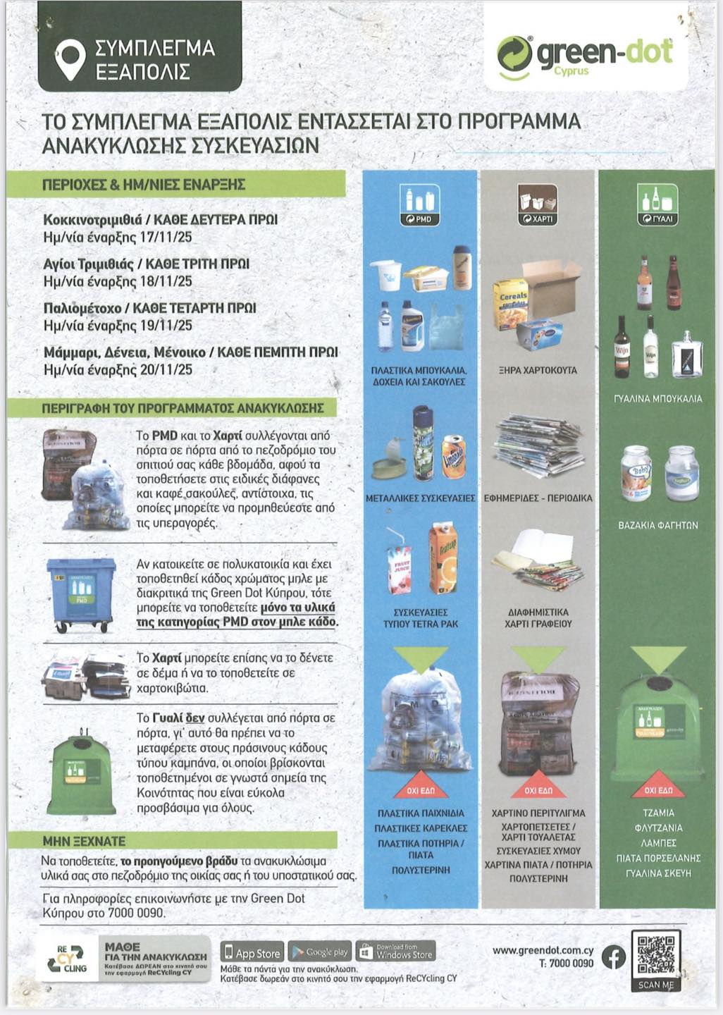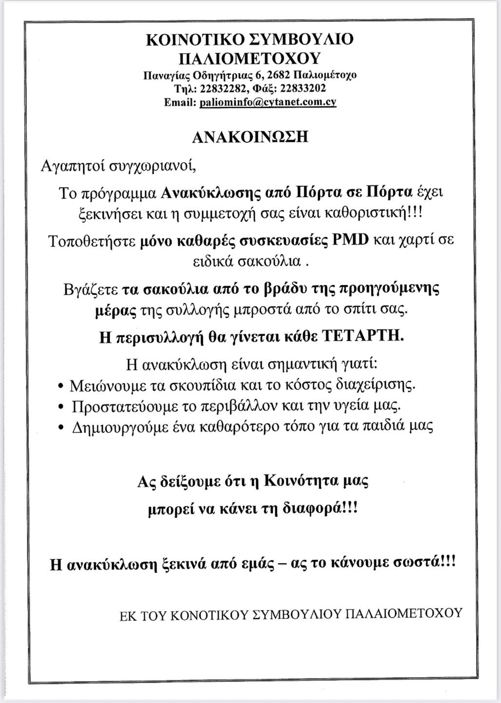 Κάθε Τετάρτη η ανακύκλωση PMD και χαρτιού στο Παλιομέτοχο – Πληροφορίες για τη διαδικασία November 27, 2025 ΕπικαιρότηταΔυτική ΛευκωσίαΠλησίον Πόλης - Ανατολική Μόρφου (ΣΤ’)Τοπικά Ξεκίνησε το πρόγραμμα Ανακύκλωσης από Πόρτα σε Πόρτα στο Παλιομέτοχο και το Κοινοτικό Συμβούλιο κάνει έκκληση για συμμετοχή από τους κατοίκους. Η περισυλλογή θα γίνεται κάθε Τετάρτη. Για όλες τις πληροφορίες δες παρακάτω: ΗΜΕΡΟΛΟΓΙΟ ΕΚΔΗΛΩΣΕΩΝ ΤΕΛΕΥΤΑΙΕΣ ΕΝΗΜΕΡΩΣΕΙΣ Δύο πυρκαγιές κατασβέστηκαν στη Λευκωσία – Η μια προκλήθηκε από… power bank Αστυνομία Σε ποιο μοναστήρι θα τελέσει Αγρυπνία ο Μόρφου Νεόφυτος την τελευταία βραδιά του χρόνου Εκκλησία Πρόγραμμα Ιερών Ακολουθιών στο Νικητάρι για τον Ιανουάριο – Αγίου Βασιλείου, Θεοφάνεια κ.α. Εκκλησία ΣΧΕΤΙΚΑ ΑΡΘΡΑ Κυρίως στα ορεινά και στο δυτικό μισό του νησιού αναμένονται βροχές – Οι επόμενες μέρες Κύπρος Μικροί και μεγάλοι Κατωκοπίτες μετέβηκαν στην Κατωκοπιά για Εκκλησιασμό – Φωτογραφίες Εκκλησία Συνεχίζονται οι έλεγχοι της Αστυνομίας λόγω εορτών – Συλλήψεις και καταγγελίες ανά το παγκύπριο Αστυνομία Previous articleΖωντάνεψε στιγμιότυπο από το παρελθόν ο Διγενής Μόρφου – Εσύ αναγνωρίζεις αυτό τον αγώνα; ΒΙΝΤΕΟNext article€27,632 για αναβάθμιση του Κοινοτικού Πάρκου, εγκρίθηκαν τα Κατύδατα – Η περίοδος υλοποίησης