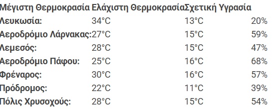 Οι θερμοκρασίες που καταγράφηκαν σήμερα και η σχετική υγρασία στις 3 το απόγευμα ήταν: