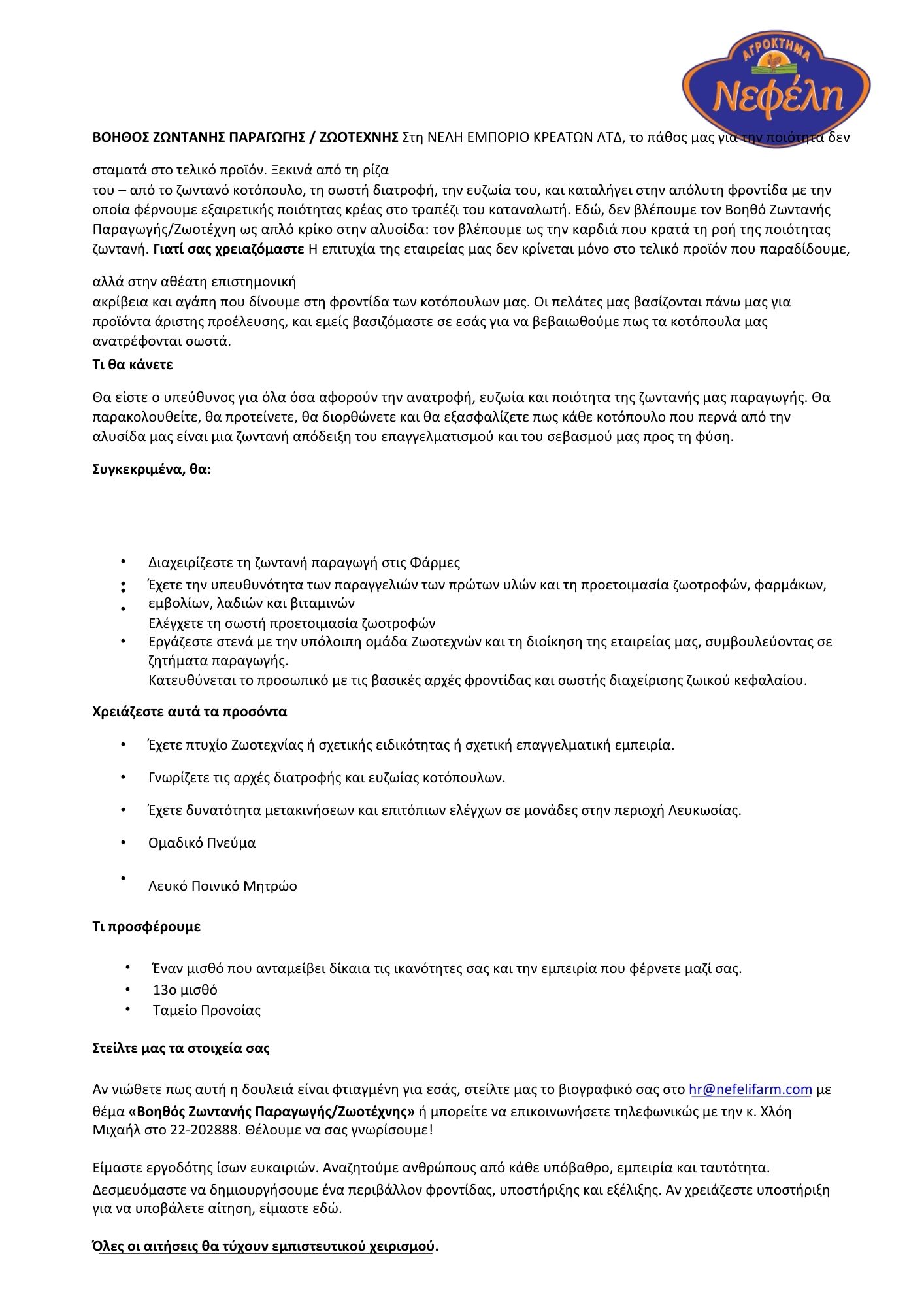 Αν θέλετε να γίνετε μέλος της οικογένειας μας και να συμβάλετε ενεργά στην επιτυχία μας, παρακαλούμε αποστείλετε το βιογραφικό σας στο hr@nefelifarm.com με θέμα την θέση εργασίας που σας ενδιαφέρει. Για περισσότερες πληροφορίες, επικοινωνήστε στο 22-202888 και ζητήστε την κα. Χλόη Μιχαήλ.