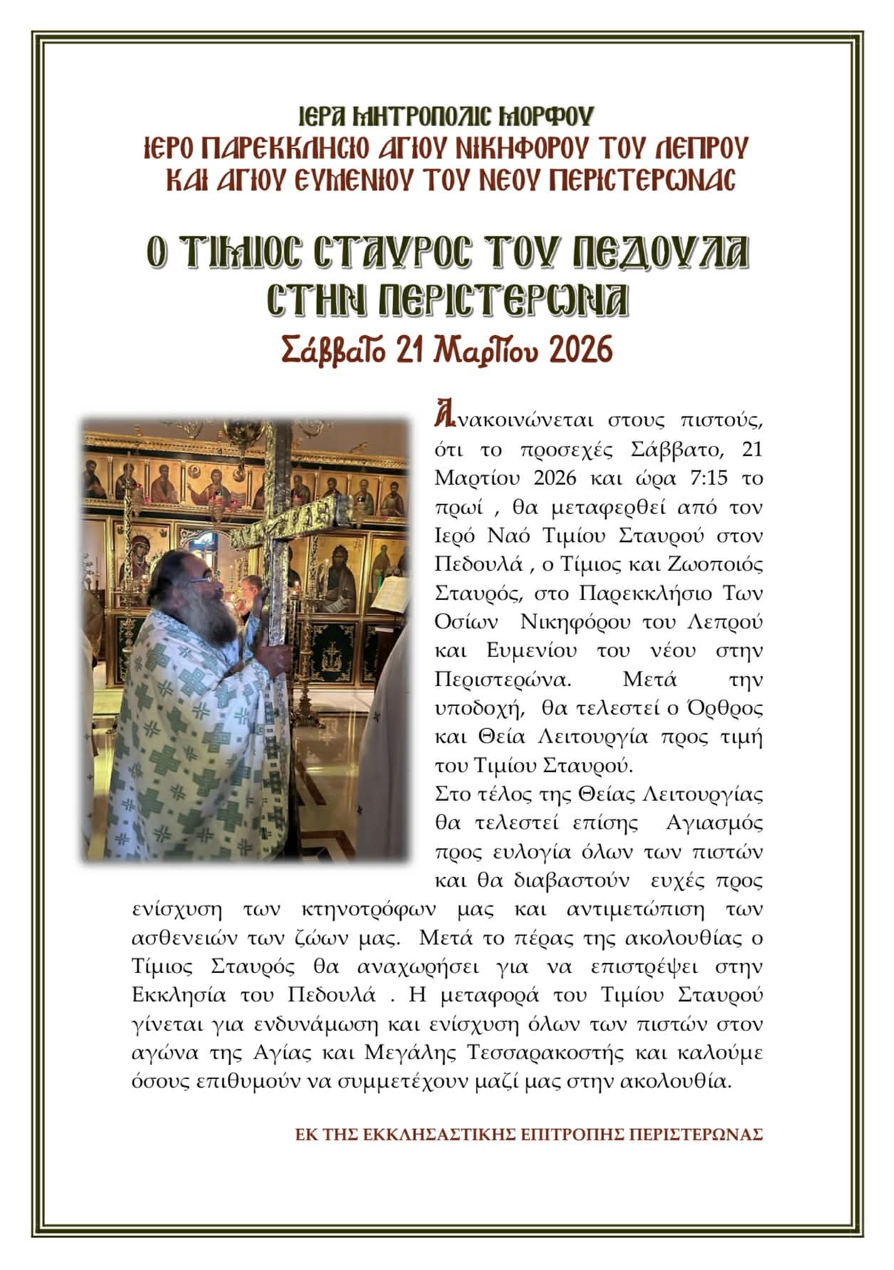 Ο Τίμιος Σταυρός θα μεταφερθεί από τον Ιερό Ναό Τιμίου Σταυρού στον Πεδουλά στο Παρεκκλήσιο των Οσίων Νικηφόρου του Λεπρού και Ευμενίου του Νέου στην Περιστερώνα.