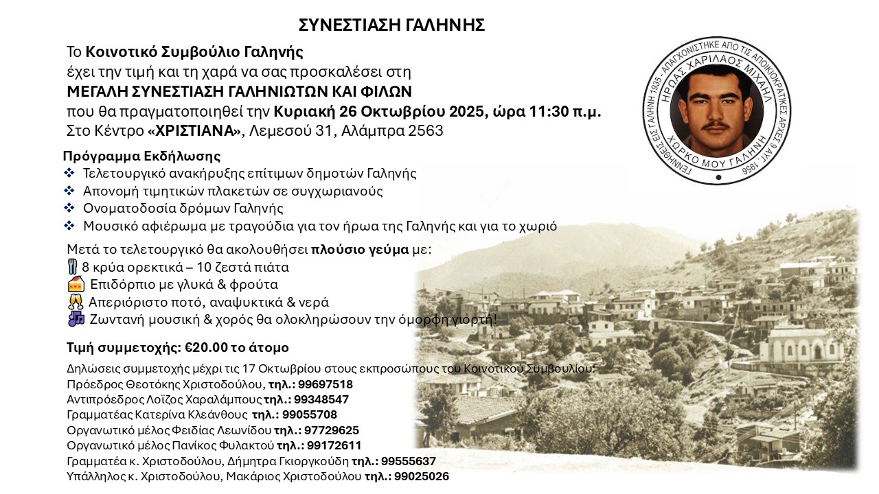 “Ευγνώμων και συγκινημένος για τη μέγιστη τιμή προς το άτομο μου, τόσο από το φίλο Πρόεδρο του Κοινοτικού Συμβουλίου όσο και των Μελών για την ανακήρυξη μου ως επίτιμος Δημότης της Γαληνής. Ένα μεγάλο ευχαριστώ μέσα απο τα βάθη της καρδιάς μου!”, καταλήγει.