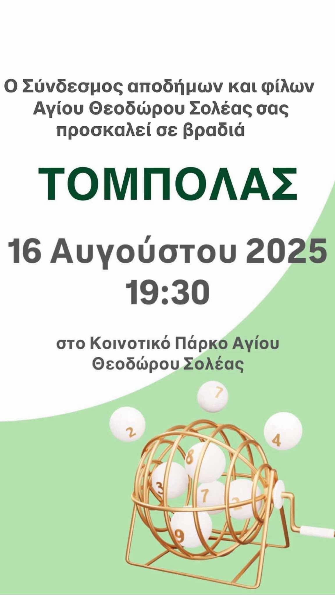Βραδιά τόμπολας διοργανώνει ο Σύνδεσμος Αποδήμων και Φίλων Αγίου Θεοδώρου Σολέας.